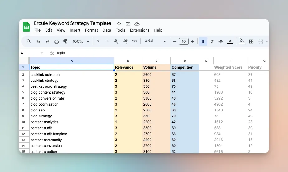 We’ll use our ércule website as an example. We’re a content performance and SEO agency. There are potentially hundreds, or even thousands, of keywords for which we could try to rank. But we know that, to be effective, we need to pick just a few and focus our content-creation efforts. So, when we built our keyword strategy for our own website, we used a method that gave us a list like this: